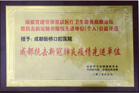 活動現場,成都市衛生健康委員會相關領導對全市抗擊新冠疫情成績突出個人和單位予以了通報表彰,新橋口腔作為其中唯一一家口腔醫療機構,榮獲“成都抗擊新冠肺炎疫情先進單位”稱號。