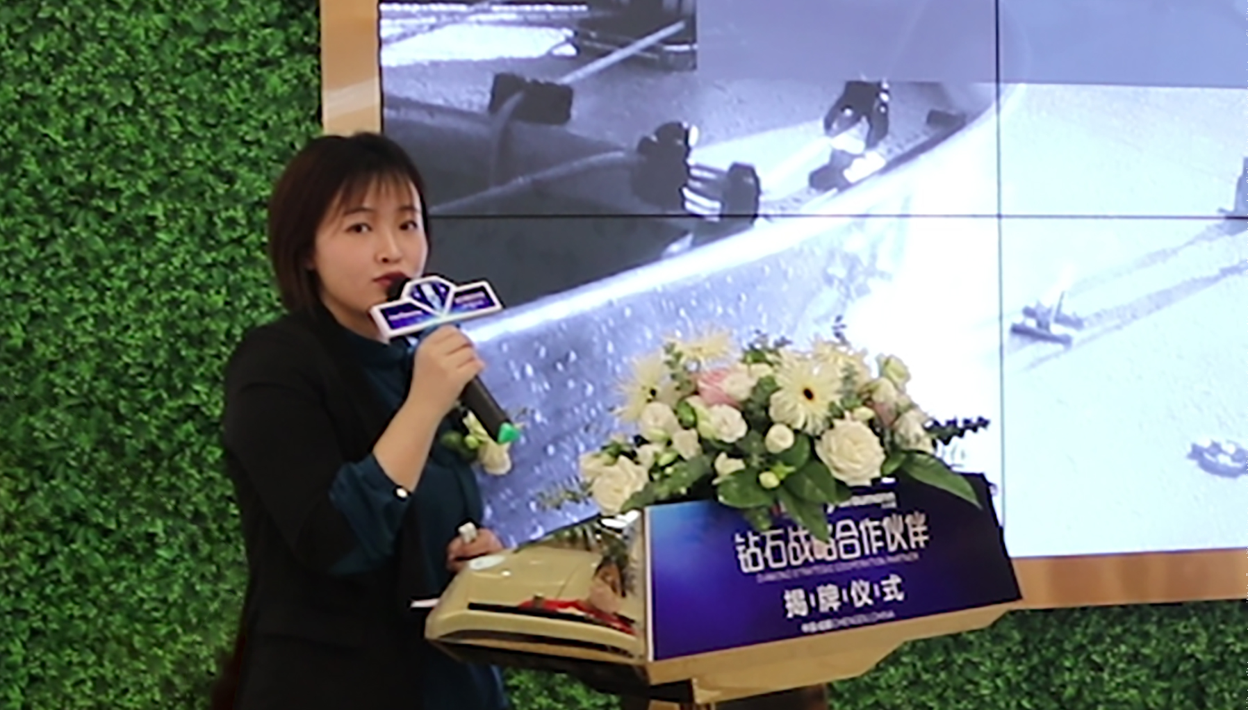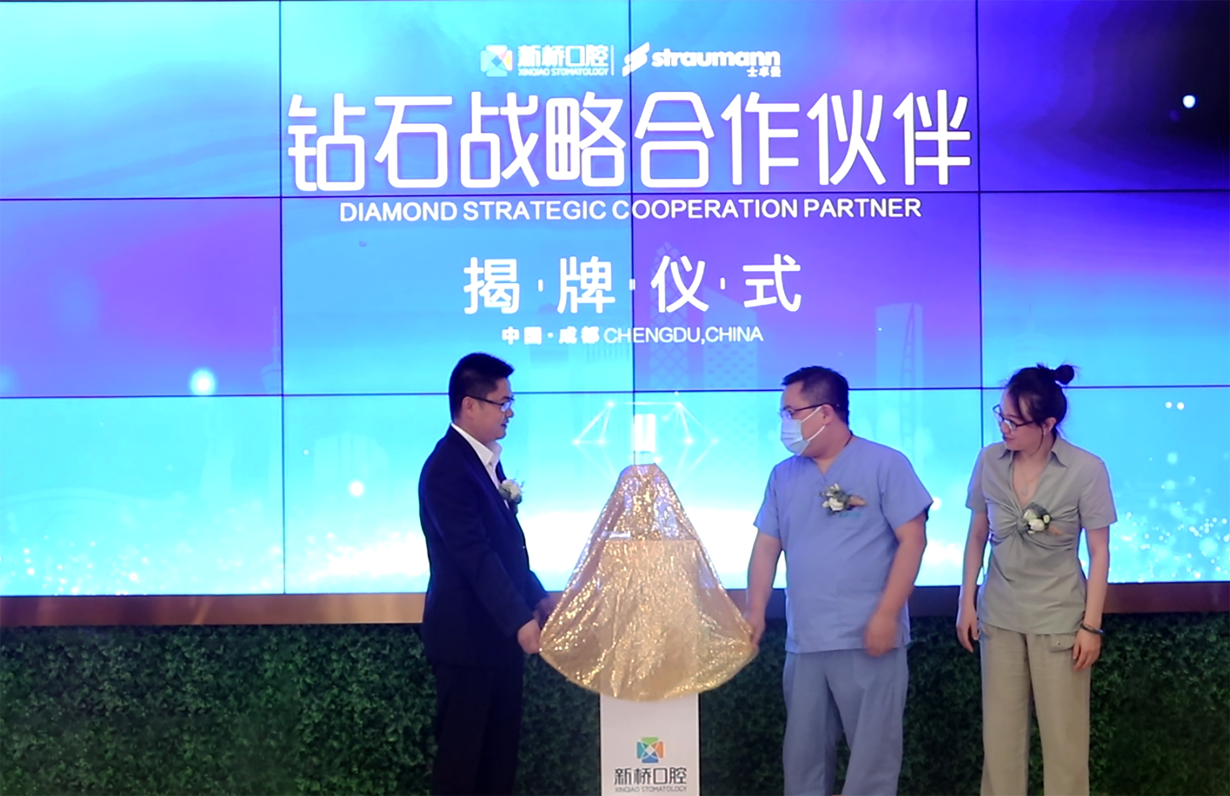 士卓曼中國銷售西區銷售總經理劉仁旺先生、士卓曼DSO南中國區銷售經理趙禎女士和新橋口腔醫療總監王鋒共同為“鉆石戰略合作伙伴”獎杯揭幕