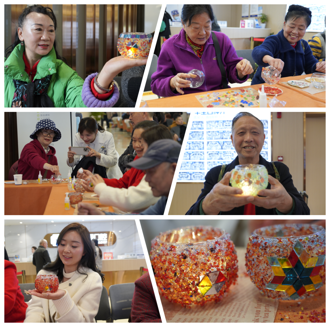制作過程中,每位參與的顧客都充分發揮了自己的創造力和想象力。他們通過設計、拼貼、上膠等工序,將一顆顆彩珠和一塊塊彩色琉璃小磚精心粘貼在玻璃燈罩上,讓原本透明的燈罩瞬間煥發出浪漫而絢麗的光彩。來參加活動的甄阿姨開心的說:“來新橋口腔參加活動我真的很開心,我在這里不僅種好牙,還能學習制作精美的工藝品,同時鍛煉了我們的動手動腦和思維能力,又有益于身心健康,真的很不錯!”
