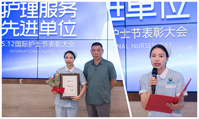 新橋口腔醫務中心總監陳曉愚為成都武侯院區頒獎(左),成都武侯院區護士長何雨發表獲獎感言(右)