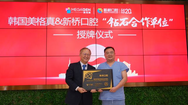 2024年5月13日,新橋口腔獲亞洲主流種植體品牌韓國美格真(MEGAGEN)種植體授牌“鉆石合作單位”,以此表彰新橋口腔在該種植體的臨床應用領域所做出的卓越貢獻,也標志著雙方將在種植技術學術板塊、產品品質優化板塊開展更高水平、更具深度的戰略合作。
