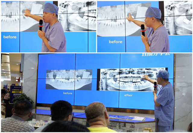 上午10:35,手術正式開始。通過實時直播屏幕,手術過程的每一細節通過大屏幕呈現給現場在座的觀眾——從實施局部麻醉,到精準的創口預備,再到種植體穩穩嵌入預定位置,直至最后縫合,姜辰醫生的操作如行云流水。