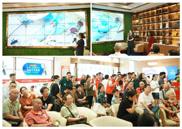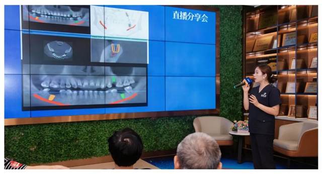 在觀眾專心致志聽講中,手術室已準備就緒。上午10點24分,直播大屏上開始實時轉播易華波主任術中的每一個細節——從局部麻醉到創口預備,再到種植體精準植入,最后縫合創口,他用近30年口腔臨床經驗,為大家展示了一場高水平的“種牙真功夫”。