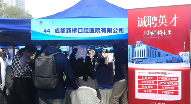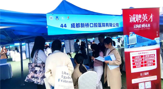 10月24日,四川大學2024年醫藥衛生類秋季校園雙選會在川大華西校區東區田徑場舉行,成都新橋口腔醫院作為口腔醫療機構代表單位受邀參加。雙選會吸引了眾多省內外醫療機構、醫藥類企事業單位參與,作為成都本土知名口腔品牌,新橋口腔的展位吸引了眾多華西口腔醫學專業的同學前來咨詢。