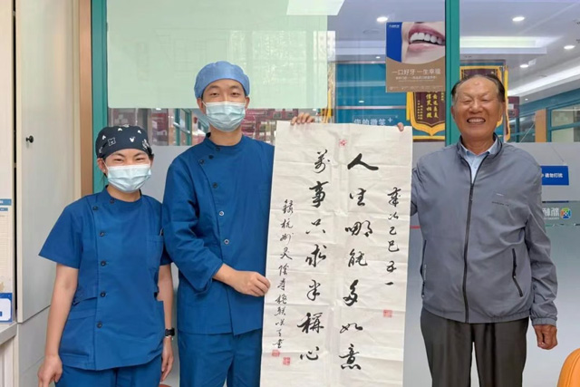 日前,新橋口腔西寧院區種植專業組副主任黃清川收到了一幅墨香四溢的書法作品。作者李秋成叔叔今年84歲,是新橋口腔西寧院區的一位種牙回頭客。 初次結緣:重獲口福,信任由此生根 回憶起2022年3月的初次種牙……